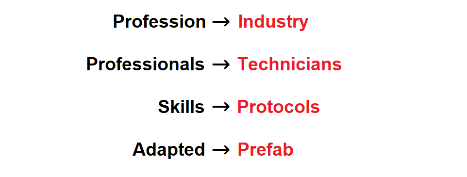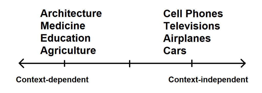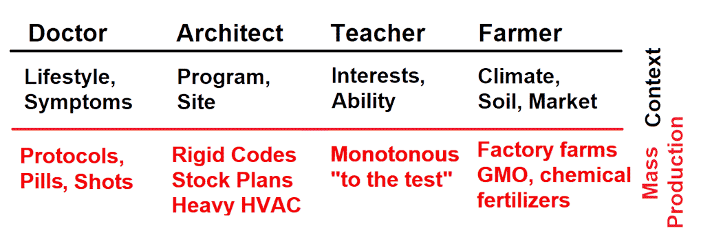 Context-dependent professions have a relational quality that is at odds with mass production. They get worse as mass production increases. We can’t mass produce a doctor-patient relationship. We can’t mass produce a teacher-student relationship. Their success depends on how well they respond to unique circumstances. An architect listens to his client and studies the site. A doctor listens to his patient for symptoms and causes.