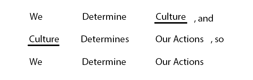 Culture Determines What We Do – Culture determines our actions, but we determine culture (with others in a democracy), so indirectly we determine our actions. In other words, we determine our actions through culture. Culture generates a range of acceptable behavior that we operate within according to circumstance.