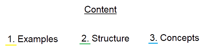 If we only teach examples, like great literature, students won’t be able to recreate it because they won’t know why it is great. They will have a rich database to reference, but they can’t independently deduce rules of grammar and other literary concepts by themselves. Students need to be taught both examples and concepts. Content includes (1) Examples, (2) Structures, and (3) Concepts.