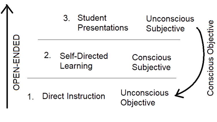 Teaching becomes more open-ended as students progress. Students begin with tightly-defined exercises as part of DI, to more open-ended research for SDL, to totally open-ended projects for SP. The final stage of specialization connects back to the first stage because once we are experts, we can present the material objectively, like how we learned it as students, before we personalized it in order to master it. The initial stage (DI) is unconscious, or feelings-based, since we defer to authority. In the second stage (SDL), we verify the information through conscious analysis as we check it against our existing knowledge. The final stage (SP) returns to unconscious action, since we become fluent with the material. In order to complete the cycle, we pass back through SDL to consciously consider how to communicate the material objectively with others (DI).