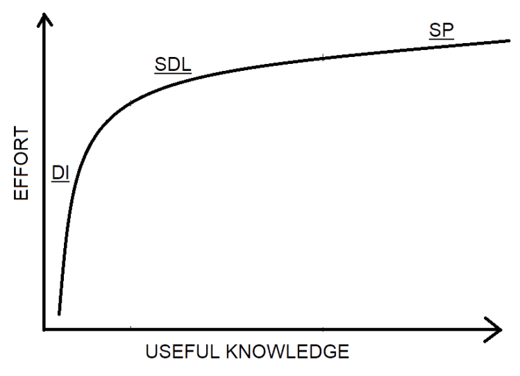 SDL builds on DI by allowing students to make sense of what they’ve learned. Students might think they understand what the teacher said, but unless they can do it themselves, they don’t really understand. They have gaps in their thinking. They need to test the information for themselves, and verify that it’s true. They need to struggle with the concept until everything “clicks”. Overly-predigested material deprives students of that experience. The initial period of not-knowing is what makes learning rewarding. The answer stays with us longer when we arrive at it ourselves, and we learn how to assimilate new information without becoming impatient during the investigation.