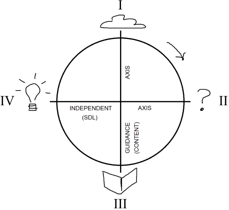 The Teaching Circle involves four stages. It explains the Teaching Cycle in more detail. The stages are either on the guidance axis (I, III), which involves teacher instruction, or they are on the independent axis (II, IV), which involves student reflection. Each stage leads to the next stage.
