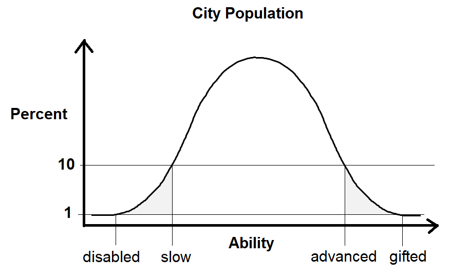 In order to find enough students of like ability, the 1% can jump 2 levels, and the 10% can jump 1 level. For example, an elementary school is at the neighborhood level, but the 1% (whether artistic, athletic, or academic) can jump 2 levels (to the city level) in order to find enough students of like ability. At the high school level, the 1% may need to jump to the college level or the regional level. The same goes for the bottom 1% and 10%, which needs to look beyond their local area to find additional resources. The percentiles should be based on the national average, in order to cover a meaningful range of ability.
