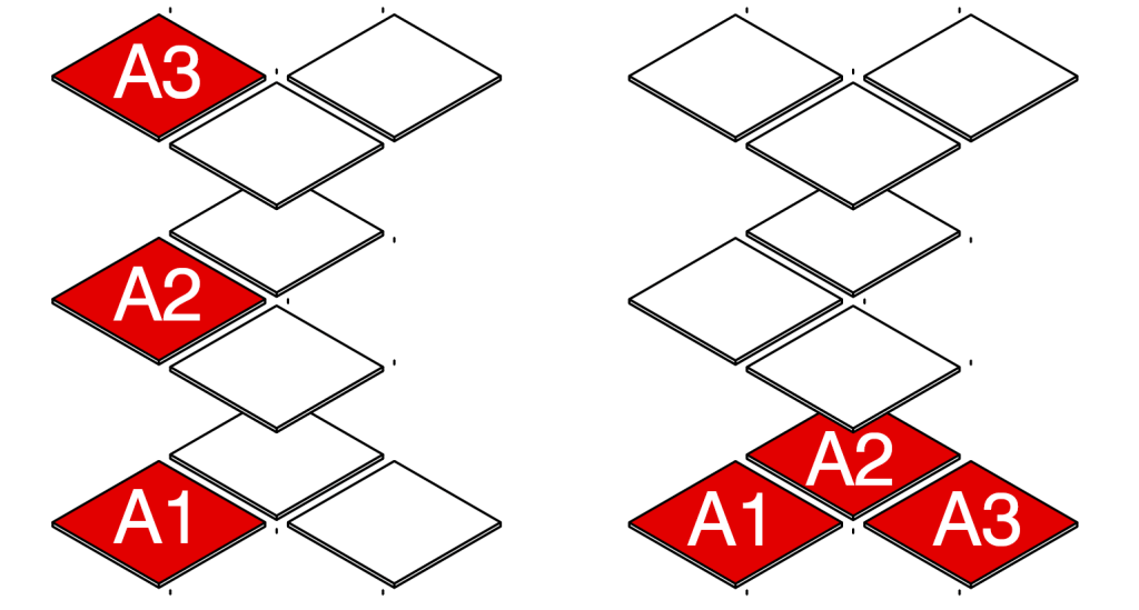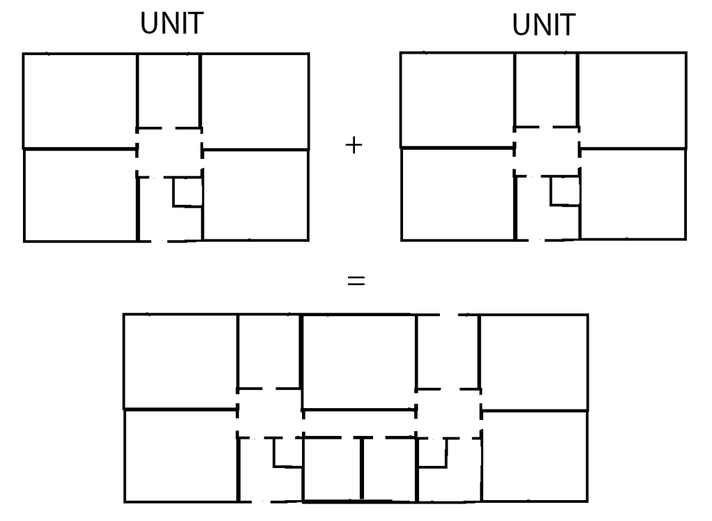We can divide the building unit into main rooms, sub-rooms, and auxiliary rooms. Main rooms are placed at the corners to receive two sides of natural light. Sub-rooms are placed in between main rooms. Auxiliary rooms are carved out for storage or miscellaneous uses. An interior room can’t receive natural light, so it can’t be a main room, unless we combine it with a main room to let in natural light.