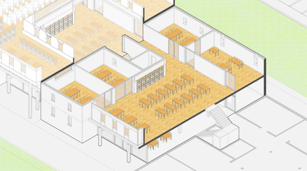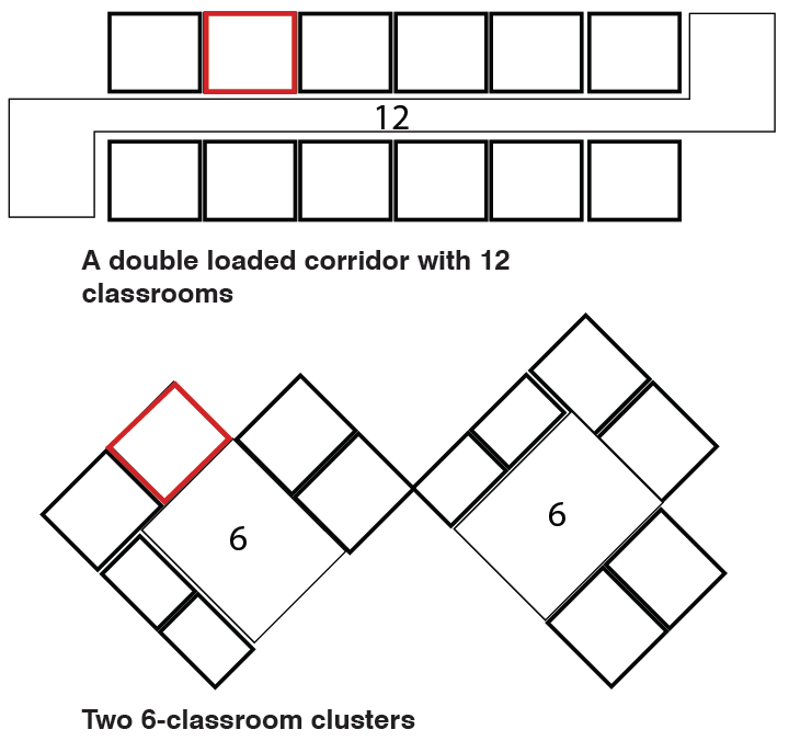 By organizing the classrooms into clusters, it strengthens their spatial presence, which strengthens the academic presence of the school. Corridors can be incorporated into the cluster as study space.