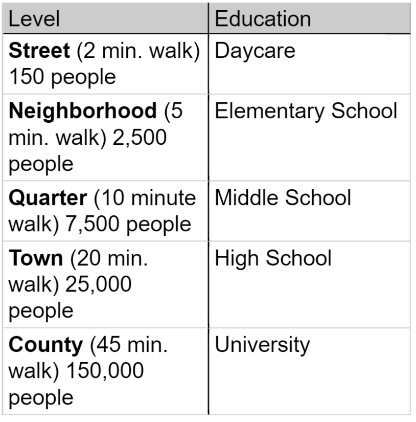 Learning communities correspond to the different levels of community. For the school to be within reasonable walk times, the density has to be at least 4 dwelling units per acre. When the density is closer to 10+ du/acre, people live closer together, so it doesn’t take as long to get to the center. In that case, the county level is more like a city, since everything is within walking distance. At that density, the city can support a high school at the neighborhood level.