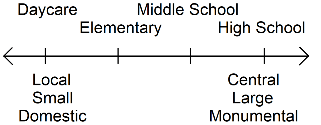 The four scales of physical community don’t cover every scenario that might exist, but they provide a useful framework. A large classroom might approximate a cluster when it’s designed as an open plan with group teaching. A middle school can have “houses” in between the level of cluster and school, with their own principal. A high school can have several buildings in a “complex”, which approaches a campus.