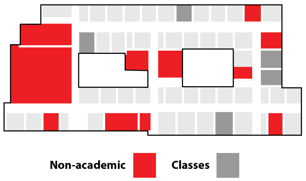 Non-academic program includes music, art, sports, etc. Too much non-academic program weakens the perceived importance of academics. Schools should take a student-centric approach to learning, which separates the functions of the student’s day. Students don’t want to run a mile and then do math. Sports can take place in a separate building. The school café can be down the street and open to the public. If non-academic program is necessary to support academic program, such as lockers, restrooms, food services, etc., it can be combined at the cluster level without disrupting the spirit of the school.