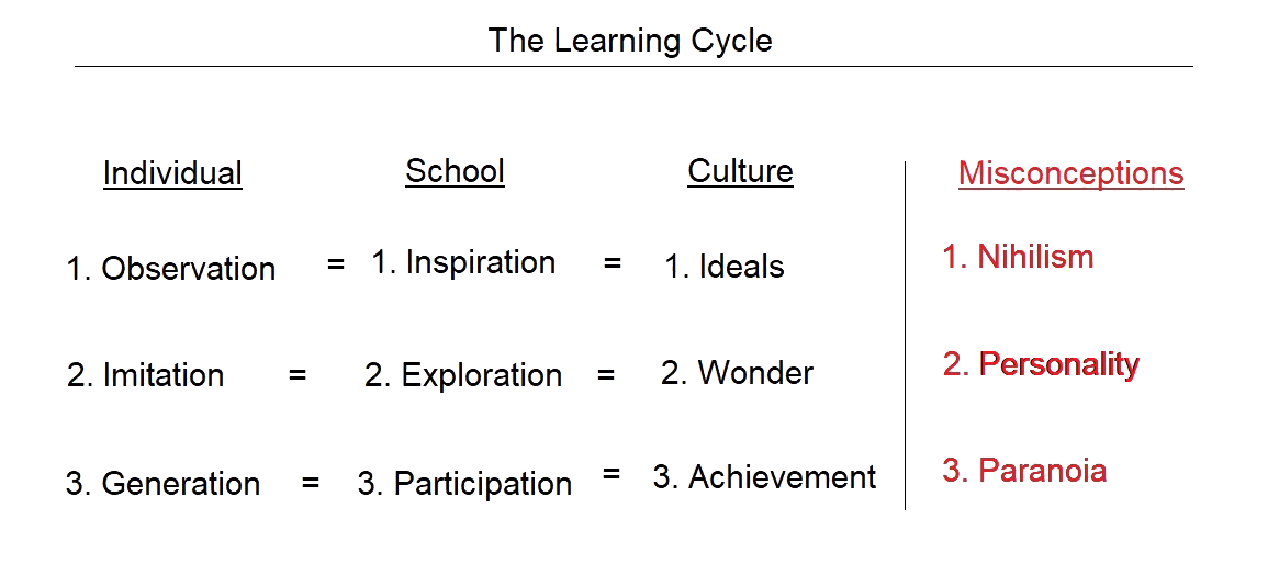 Because deceptive truths appear harmless, we should start at common misconceptions and work backwards to find their causes. We recognize their prevalence when we rephrase the learning cycle as (1) Ideals (2) Wonder, and (3) Achievement. The attacks on Ideals cause (1) Nihilism. The attacks on Wonder cause (2) Personality. And the attacks on Achievement cause (3) Paranoia. Students accept these misconceptions as excuses not to learn.
