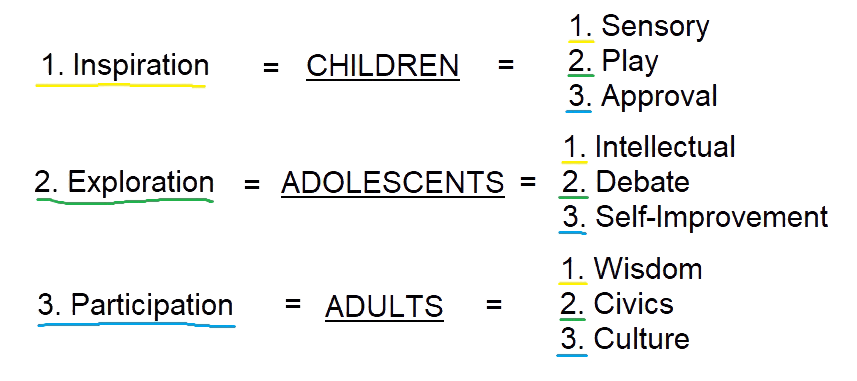 The stages of learning manifest themselves differently throughout life. Children are primarily sensory, whereas adolescents are more intellectual. At the adult level, we integrate our senses with our intellect and have wisdom. We explore wisdom through civics, and participate in culture. The three developmental stages correspond to the three stages of learning as a whole. Children represent the (1) Inspiration stage, adolescents represent the (2) Exploration stage, and adults represent the (3) Participation stage.